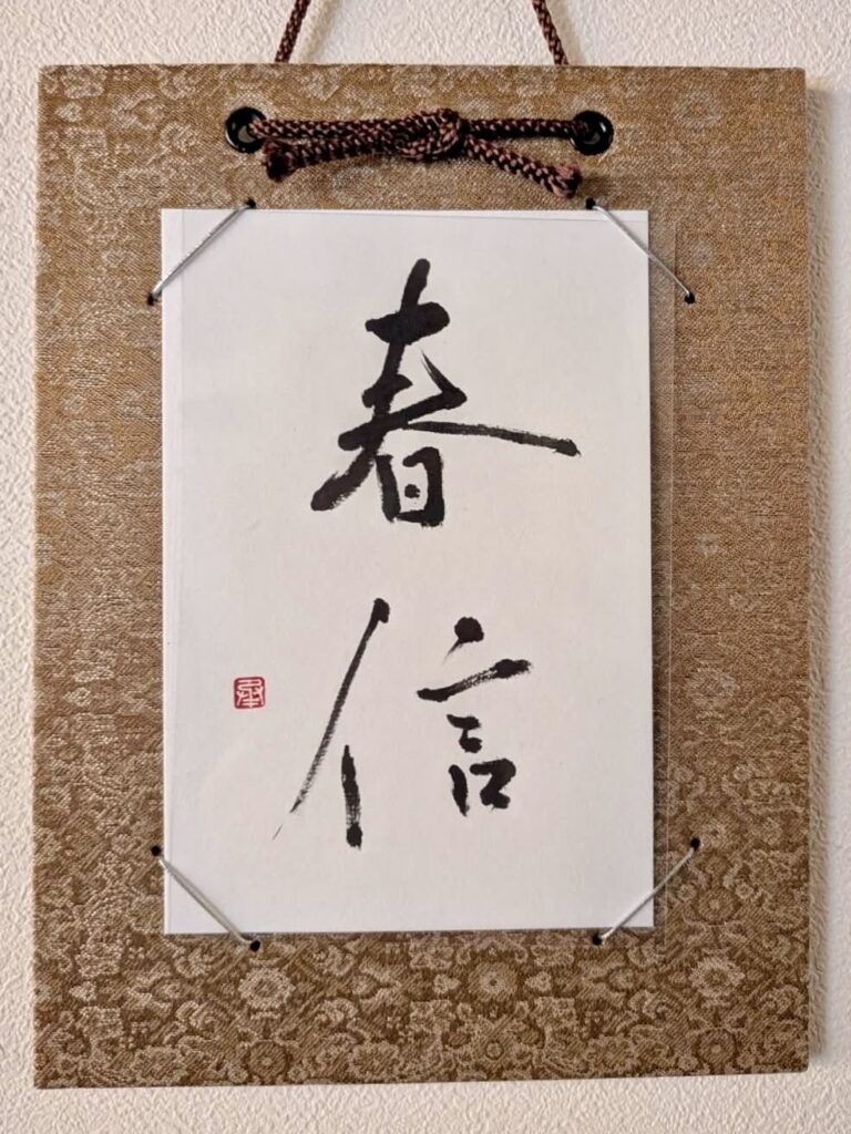 (書家 辰巳紫瑛先生 書)季節の言葉を書いていただき、ギャラリーに展示してございます。はり絵と共に、お楽しみくださいませ。