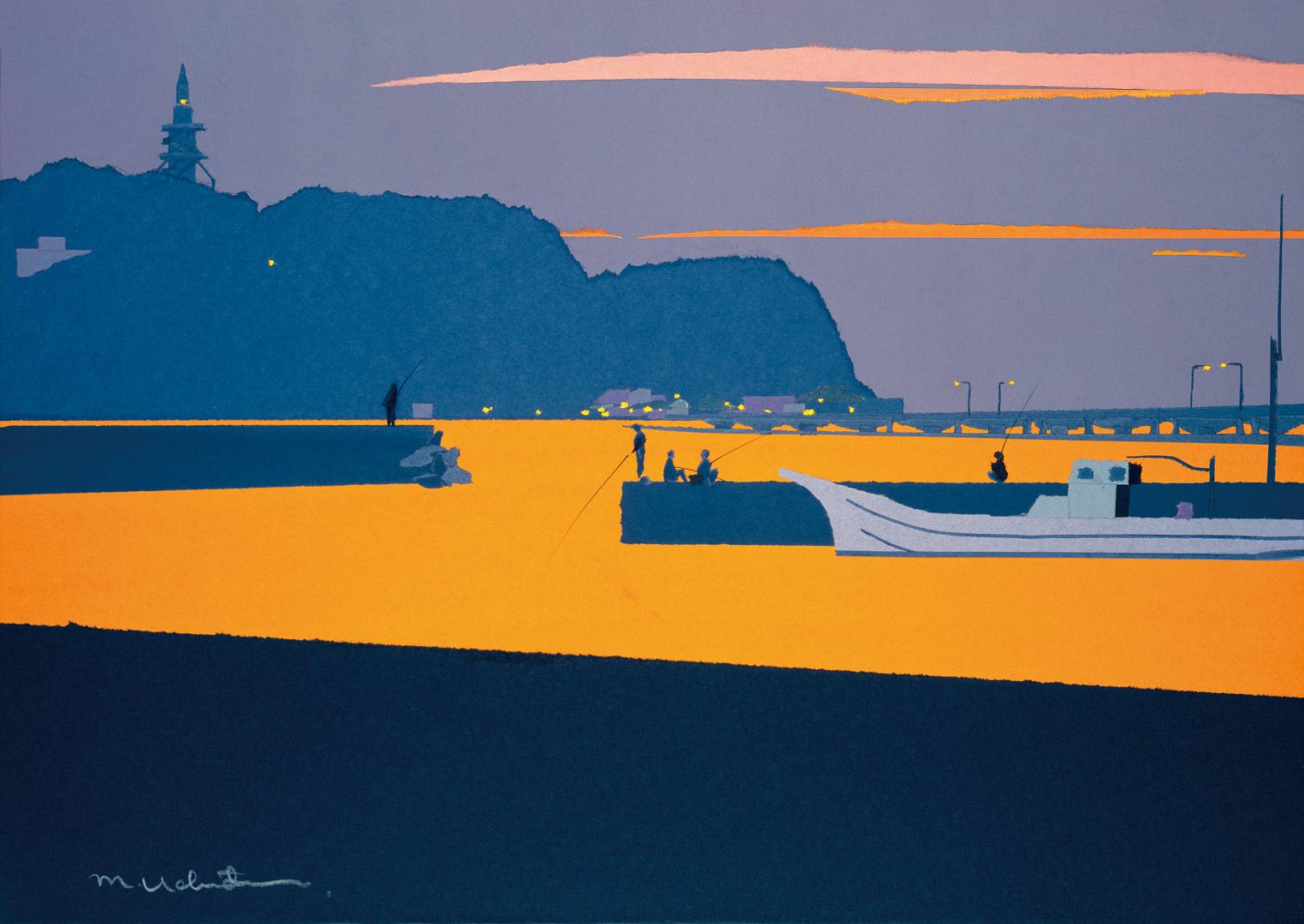 - 夕暮れ時の赤紫から紫が強くなり、それを受けて水平線が黒に変わる。黒いシルエットとなった江の島は実に絵心に迫ってくる。強まる紫の中で釣り人がますます鮮明に浮び上がってくる。空の色を水面に残しながらゆっくりと陽が沈んでいった。