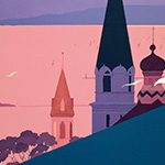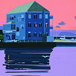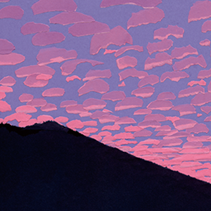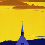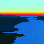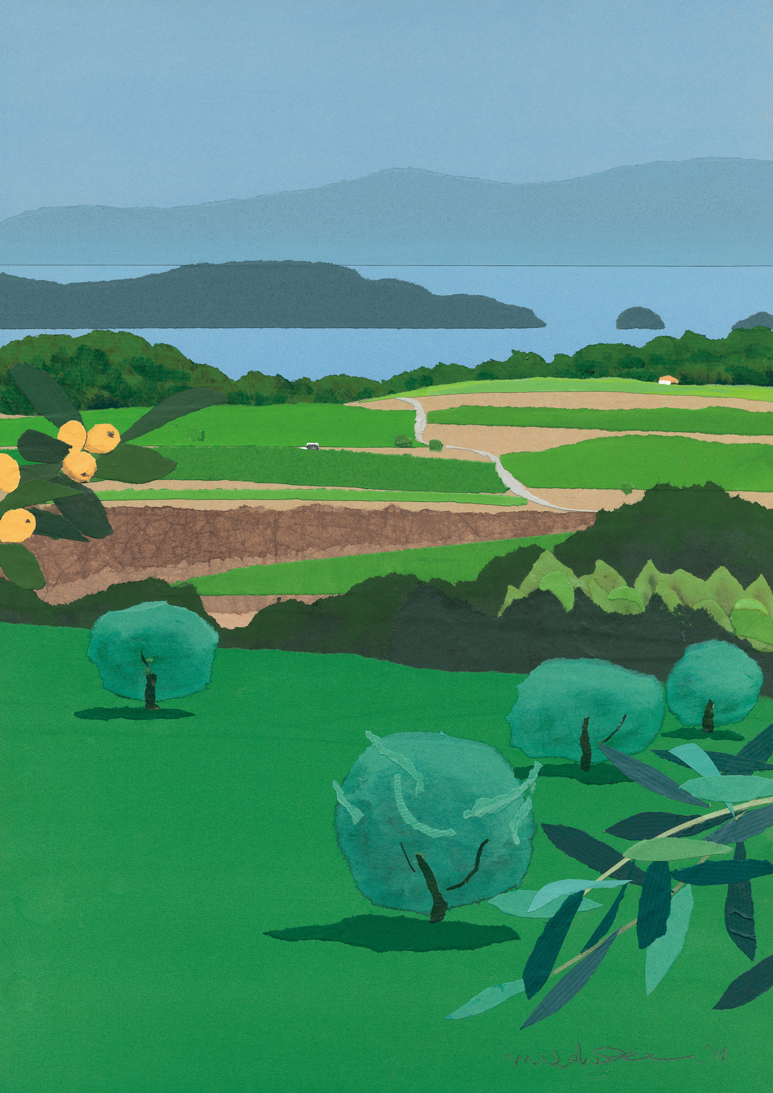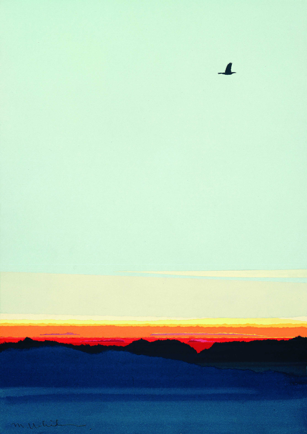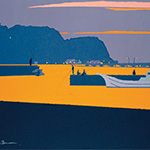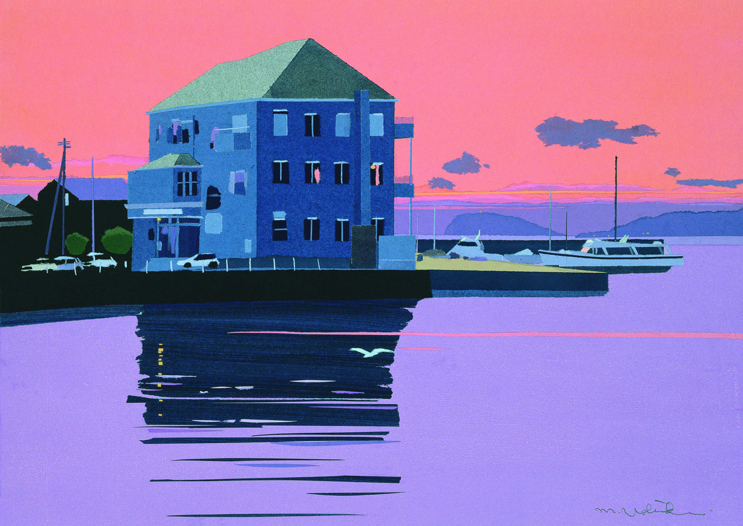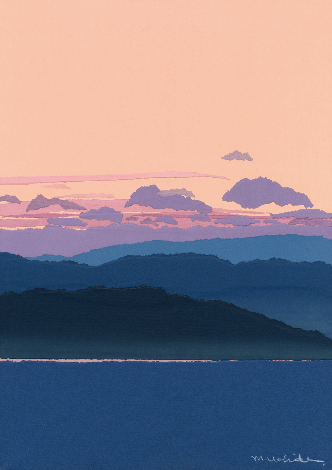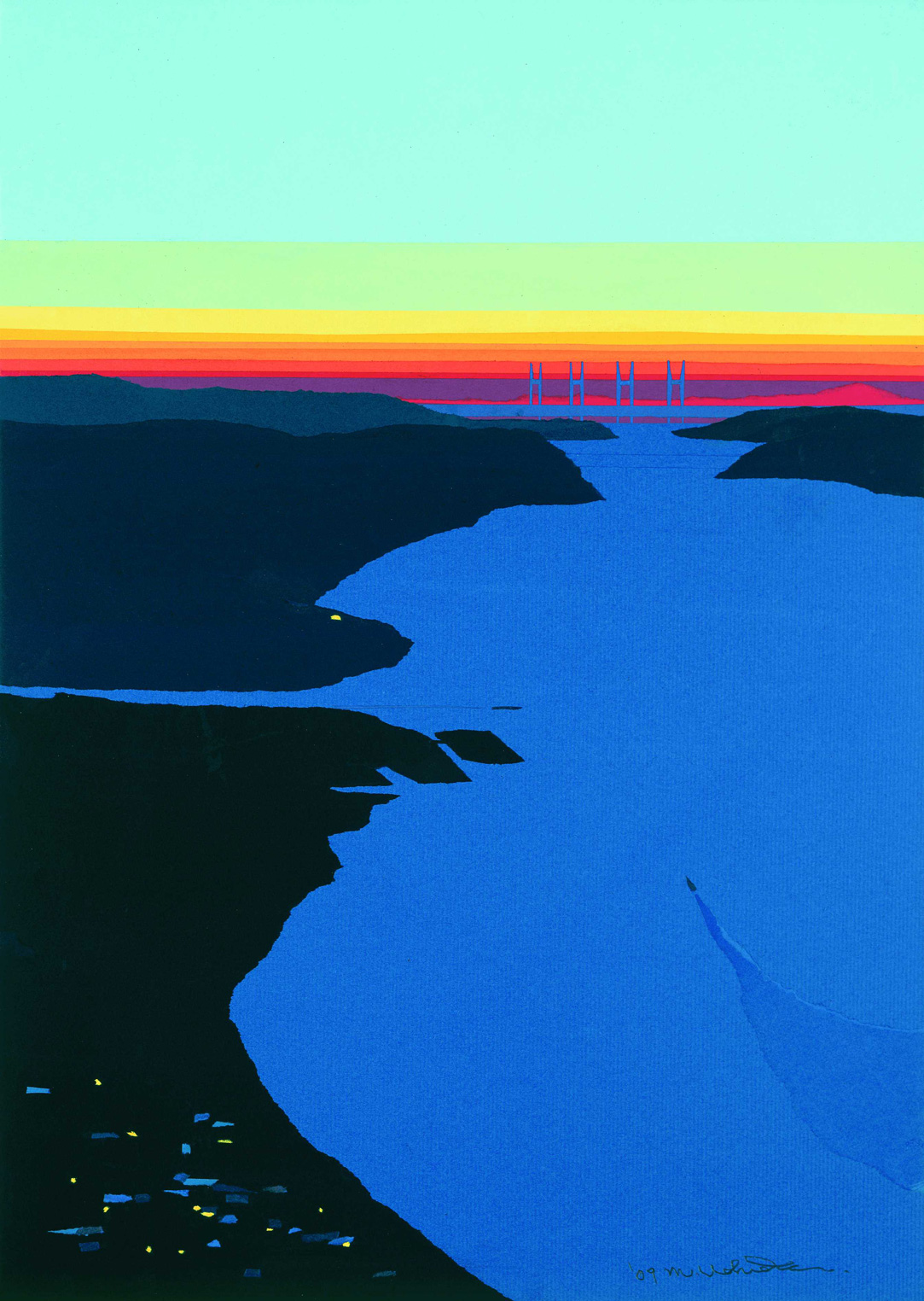 - 里山の早朝、車で海辺に沿って瀬戸大橋迄行った。夜明け前の一瞬、もっと高い所から見たら…。鳥になった気分で描いた。