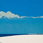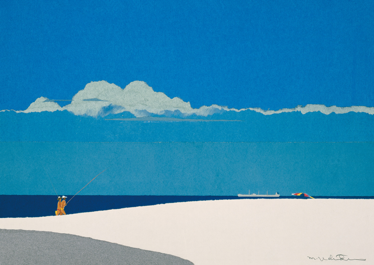- 静かで広い砂浜の山に近い樹の下で、ついうとうととまどろんでいた。 ふと、人声に目覚めると釣竿を持った青年が二人汀を歩いていた。沖には貨物船が見え、ビーチパラソルが一つ…。