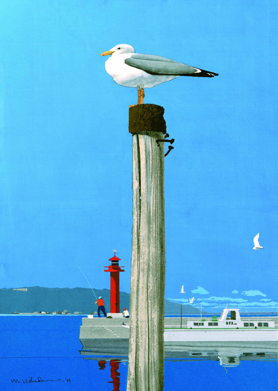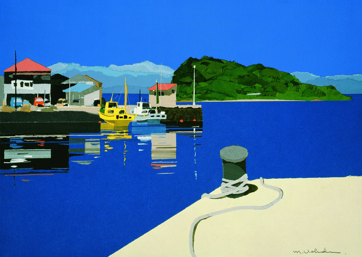 - 日盛りに地元の漁港を訪ねた。無風だったから港の波はゆったりと畝っていた。油凪だ。いつもの島、製氷会社の屋根、漁船の色、波に光る陽が…。