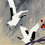 - 丹頂の頭の紅が無彩色の羽の躍動の中に美しい。野バラの実は脇役。
